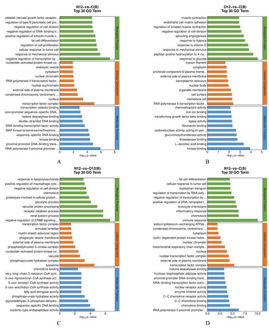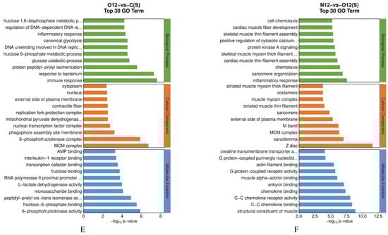 Illustration of the GO pathways in the different tissues under hypoxia and reoxygenation. (A–C) represent the results of pairwise comparisons between the brain tissues of groups C, N12, and O12, while (D–F) represent the results of pairwise comparisons between skin tissues of groups C, N12, and O12. The horizontal axes in the graphs display the names of the GO entries, and the vertical axes indicate the −log10 p values.