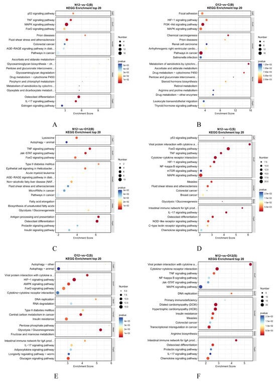 KEGG bubble plots representing the different tissues under hypoxia and reoxygenation. (A–C) present the results of two-by-two comparisons between the brain tissues of groups C, N12, and O12, while (D–F) show the outcomes of similar comparisons between the skin tissues of groups C, N12, and O12. The horizontal axes in the graphs represent the enrichment scores, where larger bubbles indicate higher numbers of differentially protein-coding genes within that entry. The bubble color transitions from blue to white and then to yellow and red with smaller enrichment p-values indicate greater statistical significance values.