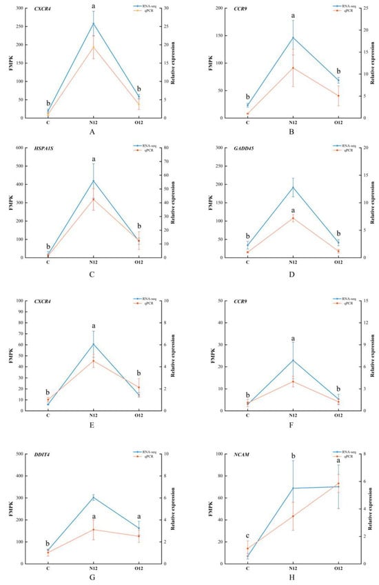 qPCR validation and RNA-seq data plots. The left Y-axes represent the gene expression levels in FMPK units obtained through the RNA-seq. The right Y-axes show the relative expression results obtained via qPCR. (A–D) correspond to the four validated genes in the skin tissues while (E–H) represent the four validated genes in the brain tissues. Different lowercase letters represent significant differences (p < 0.05), and the letters apply only to the comparison of qPCR data.