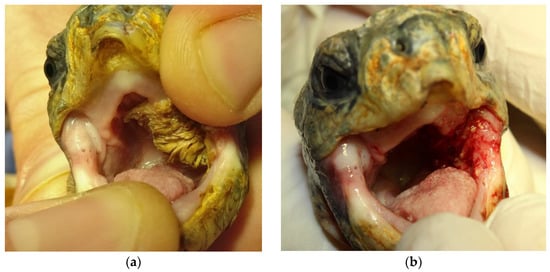 Initially, the index case tortoise received treatment for flagellate overgrowth (metronidazole 40 mg/kg PO; repeated after 14 days; Eradia, Virbac Tierarzneimittel GmbH, Bad Oldesloe, Germany). Furthermore, a supportive therapy was started with a liver-supporting product (50 mg/kg SID PO; Legaphyton®; Vetoquinol S.A., Lure, France) and probiotics (0.5 mL solution PO; BeneBac®, Dechra Veterinary Products Deutschland GmbH, Aulendorf, Germany). One week later, the tortoise was presented for a follow-up and a subsequent surgical extirpation of the oropharyngeal tissue enlargement. The patient’s overall condition had improved. It showed regular voluntary food consumption, and the faecal quality was reported to have a more solid consistency. The animal received analgetic pain therapy with meloxicam (0.3 mg/kg SC; Metacam, Boehringer Ingelheim Vetmedica GmbH, Ingelheim, Germany) and lidocaine (1 mg/kg topical; Lidor® 2%, VetViva Richter GmbH, Wels, Austria) and was then sedated with alfaxalone (5 mg/kg IV; Alfaxan®, Jurox Pty Limited, Rutherford, Australia). The tortoise maintained spontaneous breathing during the 15 min procedure and was therefore not intubated. The oral tissue mass was removed without any macroscopic leftover tissue using forceps and a sharp spoon (Figure 1b). Only minor bleeding (approximately 0.3–0.5 mL) occurred inside the oral cavity, and the animal regained full activity within 45 min after the surgical procedure.