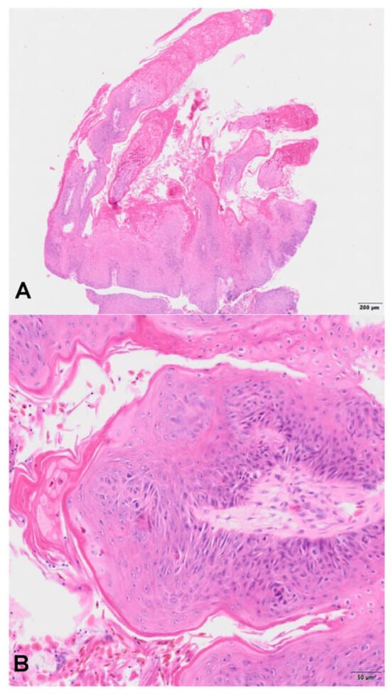 Histopathological analysis revealed fingerlike projections of keratinising squamous epithelium with marked hyperplasia and ortho- to parakeratotic hyperkeratosis (Figure 2A,B). Regular maturation of keratinocytes was retained. Koilocytes were not present. Subepithelially, low amounts of fibrovascular stromata were present. There was mild anisocytosis and karyosis. In ten high-power fields (total field of view: 1.6 mm2), one mitotic figure was present in the suprabasal epithelium. Furthermore, there was marked, multifocal, superficial, intraepithelial, supportive inflammation with multifocal small colonies of coccoid bacteria. Based on the histopathological findings, a squamous papilloma was diagnosed.
