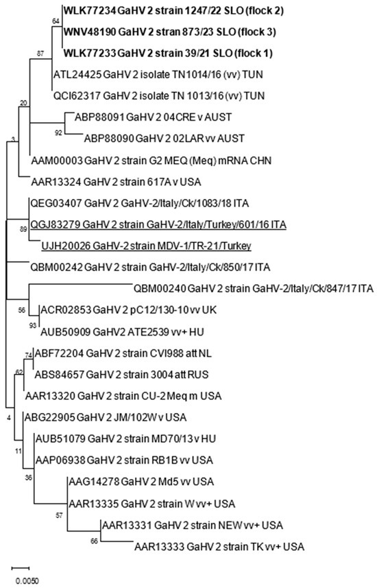 Phylogenetic relationship based on GaAHV-2 meq gene amino acid sequences of GaAHV-2 detected in turkeys in Slovenia (text in bold) and other GaAHV-2 derived from the GenBank database. Amino acid sequences obtained from turkeys are additionally underlined.