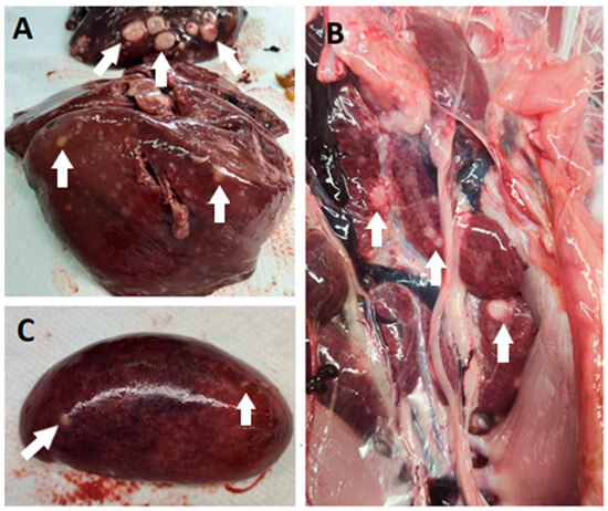 Post-mortem lesions of MD in commercial turkey flocks in Slovenia. Pale white nodules (some nodules are marked with white arrows) were found primarily in the liver (A), kidney (B), and spleen (C).