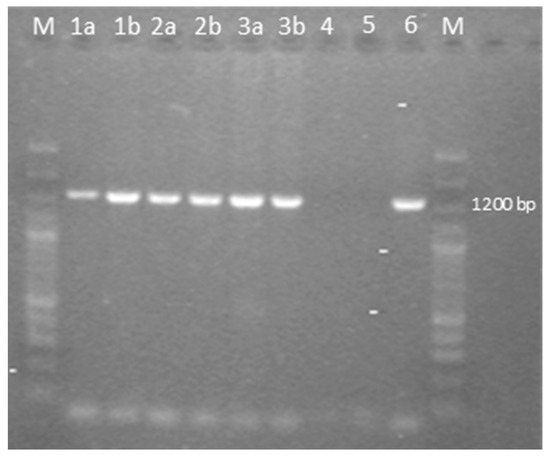 Agarose gel electrophoresis of PCR fragments of the full-length meq gene of the GaAHV-2 family, amplified by using the specific primers EcoR-F and EcoR-R. Lane M: 100 bp plus DNA ladder; lane 1a: sample 1 flock 1; lane 1b: sample 2 flock 1; lane 2a: sample 1 flock 2; lane 2b: sample 2 flock 2; lane 3a: sample 1 flock 3; lane 3b: sample 2 flock 3; lane 4: negative control; lane 5: no template control; lane 6: positive control.