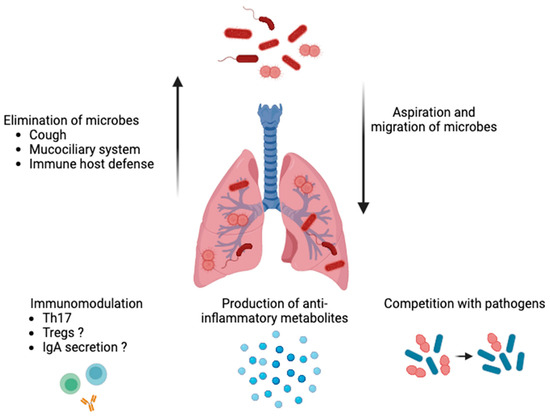 Role of airway microbiota in healthy lungs. The bacterial microbiota are determined by the state of balance between the micro-aspirations from the upper airways and migration of bacteria along the mucosal surfaces and their clearance (e.g., via coughing, the mucociliary system, and a host’s immune defenses). Respiratory microbiota can produce metabolites, compete with potential pathogens for space and nutrients, contribute to maintaining homeostasis (e.g., pH and oxygen tension levels), and promote immunomodulation (by inducing a T-helper cell-type 17 response and, possibly, regulatory T cells (Tregs) and immunoglobulins (Ig) A). The image was created using BioRender.com, accessed on 16 December 2023.