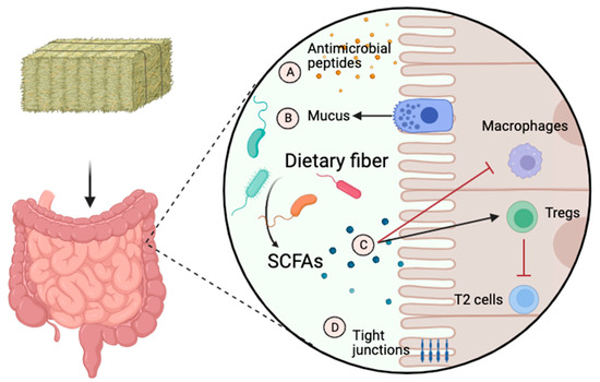 The role of short-chain fatty acids in local and systemic immunity. Short-chain fatty acids (SCFAs) such as acetate, butyrate, and propionate are produced through the fermentation of fibers by fibrolytic bacteria. They regulate the gut’s barrier function by stimulating intestinal epithelial cells to secrete antimicrobial peptides (A) and mucus (B). They attenuate inflammatory and allergic responses in the lungs (C) by communicating with regulatory T cells (Tregs) and antigen-presenting cells such as macrophages. They also upregulate tight junction proteins (D). T2, type 2 inflammation. The image was created using BioRender.com, accessed on 16 December 2023.