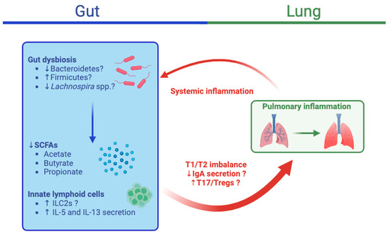 Integrative view of the gut–lung axis in asthma. Gut dysbiosis can lead to the decreased production of short-chain fatty acids (SCFAs) due to decreases in the relative abundances of Bacteroidetes and Lachnospira spp or an increase in Firmicutes. Furthermore, innate lymphoid cells 2 (ILC2s) can stimulate the secretion of interleukin (IL)-5 and IL-13 and the T2 differentiation of dendritic cells, which can initiate and promote allergic airway inflammation. The dysregulation of IgA secretion, T1/T2 imbalances, and increased T17/Treg responses resulting from these changes can lead to airway inflammation, as has been observed in asthma. The crosstalk from the lungs to the gut remains unclear, but resulting systemic inflammation could further contribute to gut dysbiosis and inflammation. IL, interleukin; T1, type 1 inflammation; T2, type 2 inflammation. The image was created using BioRender.com, accessed on 19 December 2023.