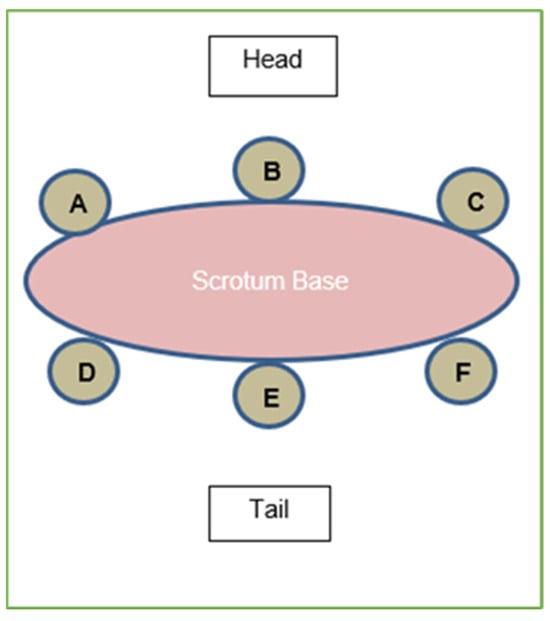 Sample injection and biopsy site layout for lamb scrotums. The same layout was used for lamb tails. Locations of sites A–F were randomized for each animal and were color-coded with markers. Treated lambs received an injection of 2% lidocaine (without epinephrine) at sites A–F to create a ring block; 1 mL for scrotal site, 0.5 mL for tail sites.