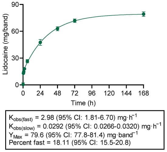 In Vitro Release of Lidocaine from Lidocaine-Loaded Bands (LLBs) (Dissolution Testing). Data represent the mean ± SD of 6 individual bands (i.e., 6 dissolution vessels). PBS was used as the dissolution medium. Data were best fit with an equation for 2-phase exponential release.
