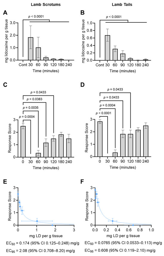 The electrostimulation response scores from Figure 3C,D were plotted against the tissue lidocaine concentrations from Figure 3A,B, and non-linear regression was used to calculate the EC50 and EC95 values. EC50 was 0.174 and 0.0765 mg/g for scrotums and tails, respectively; EC95 was 2.08 and 0.608 mg/g for scrotums and tails, respectively (Figure 3E,F).