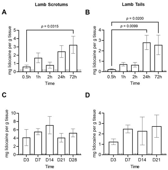 Lidocaine was not detected in tissue from control animals. In lambs treated with LLBs, tissue lidocaine levels reached or exceeded the EC50 in as little as 30 min (Figure 4A,B). Moreover, tissue lidocaine accumulated in these tissues, yielding a significant linear trend (p = 0.0081 and 0.007 for scrotums and tails, respectively; Figure 4A,B). Finally, lidocaine levels remained well above the EC50 for 21–28 days for tails and scrotums (Figure 4C,D).