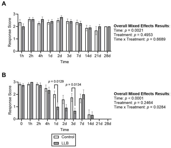Finally, the response to electrostimulation at the tail site was compared for control- and LLB-banded animals. When tissue proximal to the band was stimulated, response scores were similar over time regardless of treatment group (Figure 5A), confirming that un-banded tissue had full sensation over the time course. On the other hand, when tissue in contact with the bands was stimulated, the response scores decreased over time regardless of treatment group (Figure 5B), indicating a loss of sensation in banded tissue over the time course; an exception was apparent at Day 7 when response scores transiently increased before resuming their downward trajectory. However, the LLB-banded group had a lower response score than the control group on days 1 and 3 following the application of the bands (Figure 5B).