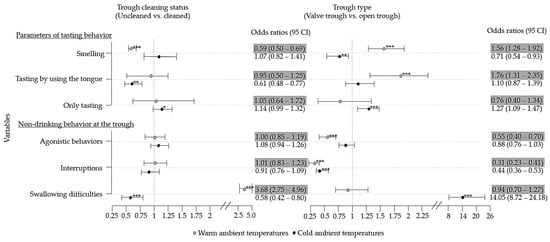 Figure 1. Effects of trough type and trough cleaning interval on dairy cows’ drinking behavior in two climatic conditions (warm ambient temperatures and cold ambient temperatures), visualized by odds ratios (dots and whiskers showing the 95% confidence intervals (CI)). * 0.05 < p < 0.1; ** p < 0.05; *** p < 0.01.