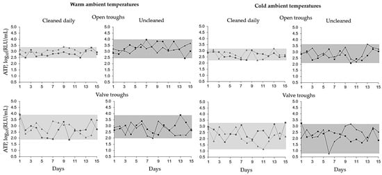 Figure 2. Adenosine triphosphate (ATP) content in four troughs (open trough 1 , open trough 2 ∎, valve trough 1 and valve trough 2 ∎) in cold ambient temperatures and warm ambient temperatures. Troughs were cleaned daily or not cleaned for 15 days. The ATP range is shown in grey.
