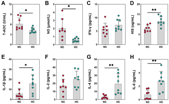 The antioxidant and immune indicators of growing goats fed normal-concentrate diet (NC) and high-concentrate diet (HC). (A) T-AOC, total antioxidant capacity; (B) NO, Nitric Oxide; (C) IFN-γ, interferon-γ; (D) HIS, Histamine; (E) IL-1β, interleukin-1β; (F) IL-2, interleukin-2; (G) IL-4, interleukin-4; (H) IL-6, interleukin-6. (*) 0.01 < p < 0.05; (**) p < 0.01.