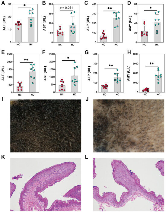 The results shown in Figure 2A demonstrated that the ALT concentration in plasma was increased by the HC diet (p = 0.025). And the AST concentration in plasma was also increased by the HC diet compared to the NC diet (p = 0.051) (Figure 2B). The ALP concentration in plasma was notably increased when a diet administered to steers was switched from 55% concentrate diet to 90% concentrate diet (p < 0.001) (Figure 2C). Results for plasma AMY concentration were significantly boosted for the HC group compared to the NC group (p = 0.015) (Figure 2D), where ALT (p < 0.001) and AST (p = 0.025) concentrations in rumen were increased in this experimental model by increasing the grain percentage of the diet to induce SARA (Figure 2E,F). And the HC diet elevated significantly the ALP (p < 0.001) and AMY (p < 0.001) in rumen compared to the NC diet fed to growing goats (Figure 2G,H). The rumen epithelium from the NC group showed an intact structure while the rumen epithelium of the HC group showed an indication of sloughing in the stratum corneum (Figure 2I–L).