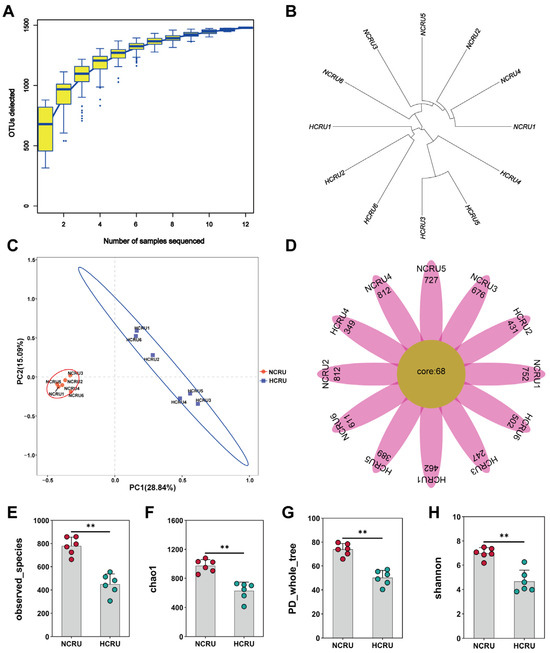 Rumen microflora of growing goats fed normal-concentrate diet (NC) and high-concentrate diet (HC). (A) Species accumulation curves. (B) Hierarchical clustering (NCRU1–NCRU6 and HCRU1–HCRU6 are rumen samples of goats fed with 55% or 90% concentrate, separately). (C) Principal component analysis (PCA) of rumen bacterial community. (D) Flower plot. (E–H) Alpha diversity indices of rumen bacterial community. (**) p < 0.01.