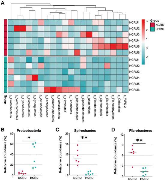 (A) Heatmap based on hierarchical clustering solution at phylum level (Bray-Curtis distance metric and complete clustering method) in rumen for goats fed a normal diet (NCRU) or a high-concentrate diet (HCRU), shown across columns. (B–D) Differential bacteria in the rumen at the phylum level. (*) 0.01 < p < 0.05; (**) p < 0.01.