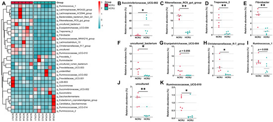 (A) Heatmap based on hierarchical clustering solution at genus level (Bray-Curtis distance metric and complete clustering method) in rumen for goats fed a normal diet (NCRU) or a high-concentrate diet (HCRU), shown across rows. (B–K) Differential bacteria in the rumen at the genus level. (*) 0.01 < p < 0.05; (**) p < 0.01.