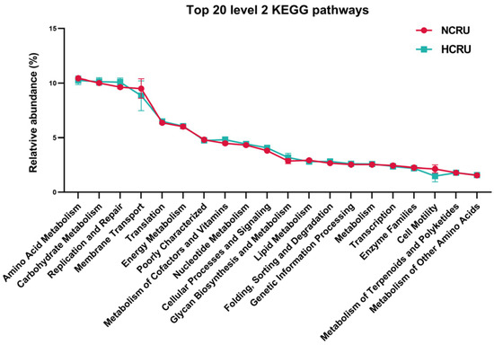 Top 20 predicted metagenomic functions at level 2 of the KEGG (Kyoto Encyclopedia of Genes and Genomes) pathways in rumen bacteria of goats fed the NC and HC diets.