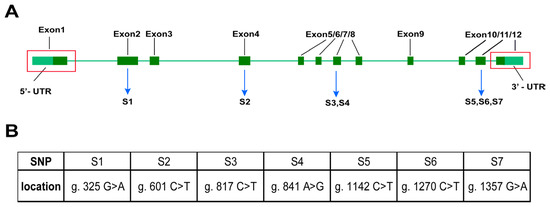 Sequence structure and SNP loci in the coding region of p38 in tilapia. (A) SNP loci in the coding region of p38 in tilapia. (B) The information of specific SNP loci.