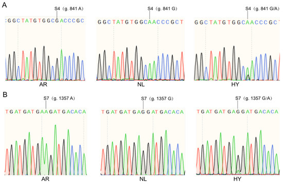Identification of SNP loci in coding regions of p38 among NL, AR, and HY. (A) Genotypes of S4 on NL, AR, and HY; (B) genotypes of S7 on NL, AR, and HY.