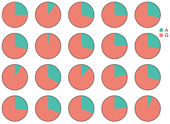 Pyrophosphate sequencing was carried out using S7 (g. 1357 G > A) as the locus, and the p38 allele expression frequency in HY showed that alleles from NL and AR showed a bias in expression in liver tissue (Figure 4; Table S1). The number of mRNAs of the alleles from NL (G) to the expression frequency ratio of the alleles from AR (A) in HY individuals was 77:23, and the expression level of the alleles from NL was much higher than that of the alleles from AR. HY individuals were mainly dominated by the alleles from NL in p38 and the cis effect obtained for the NL/AR allele ratio within HY was 1.74.