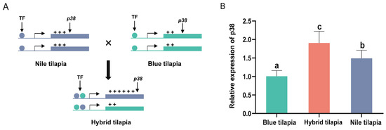 According to Shi et al.’s [27] model of allele expression analysis, the allelic cis–trans effects of p38 alleles from Nile tilapia and blue tilapia were calculated in hybrid tilapia individuals, as shown in Figure 1.