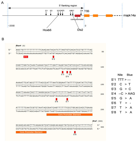Transcription acts as a bridge between genotype and trait [37], and is influenced by various factors such as environmental conditions, epigenetic regulation, and transcription factors [38]. Recent advancements in sequencing technology have allowed researchers to delve deeper into the study of allelic differential expression in biological hybrids. High-throughput techniques have revealed a significant number of allele-specific expressions (ASE) in plants and animals, confirming the considerable impact of cis-acting element variations on allelic expression differences [39,40,41]. Consequently, it is hypothesized that single-nucleotide polymorphism (SNP) variants at specific loci (S’3 and S’7 sites) may induce changes in cis-acting elements within the promoter region of p38 in Nile tilapia and blue tilapia.