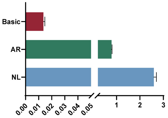 Real-time quantitative PCR (qRT-PCR) was performed on p38 in the liver tissue of NL, AR, and HY. Each group had three replicates and β-actin was used as a quantitative reference gene. The primers were designed by Primer Premier 5.0 (Premier, Markham, ON, Canada; Table 1). Real-time PCR was performed on an ABI 7900HT instrument (Applied Biosystems, Foster City, CA, USA). The qRT-PCR reaction volume was 20 μL: 10 μL of ChamQ SYBR qRT-PCR Master Mix (Vazyme, Nanjing, China), 0.4 μL of each forward and reverse primer (10 μM), 1.0 μL of cDNA template, and 8.2 μL of RNase-free water. The reaction procedure was set as follows: initial denaturation at 95 °C for 30 s; 95 °C for 10 s; 60 °C for 30 s; 40 cycles. This was followed by a melting curve analysis (95 °C for 10 s, 60 °C for 60 s, and 95 °C for 15 s). The transcript levels of the target gene were analyzed by the 2−ΔΔCt method. All the data are expressed as mean ± SD, with p < 0.05 representing significant differences.
