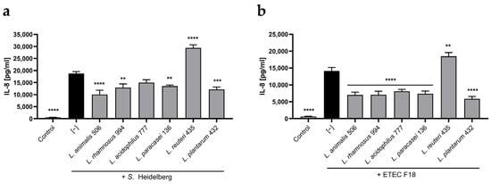L.animalis 506 and other probiotic strains regulate pathogen-induced intestinal epithelial inflammatory responses. HT29 cell monolayers were incubated or not with probiotic Lactobacillus sp. strains for two hours, after which S. Heidelberg (a) or ETEC F18 (b) were added, and the co-cultures were incubated for an additional three hours. The supernatants were then aspirated, the cell monolayers were washed, and fresh media with gentamycin was added, followed by an additional 20 h of incubation. The supernatants were collected, and their IL-8 levels were quantified using ELISA. Data are expressed as means + SEM (n = 8). **** (p < 0.0001), *** (p < 0.001), and ** (p < 0.01) indicate significant differences from the respective “pathogen only” groups.