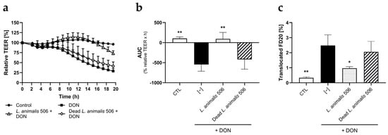 L. animalis 506 ameliorates the damaging effect of deoxynivalenol (DON) on gut barrier integrity. Caco-2 cell monolayers were exposed on the apical side and basolateral side to DON (50 µM) in the presence or absence of live or dead L. animalis 506 and in the presence of FD20, both on the apical side. TEER was measured for a total of 20 h, after which the amount of FD20 translocated to the basolateral compartment was quantified. Data are expressed as means of relative TEER (a), normalized AUC (b), and translocated FD20 (c) + SD (n = 3). ** (p < 0.01); * (p < 0.05) indicate significant differences from the “DON only” group.