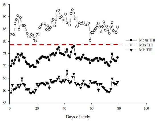Temperature–humidity index (THI) during the experimental period. The cutoff point for heat stress is indicated by the dotted red line (THI ≥ 78).