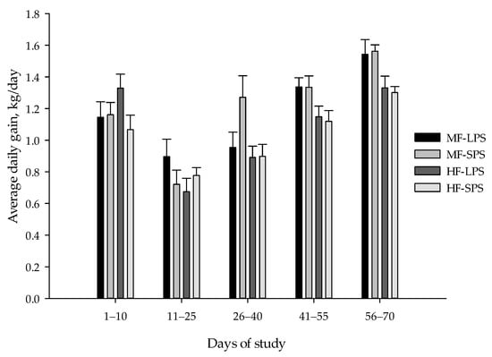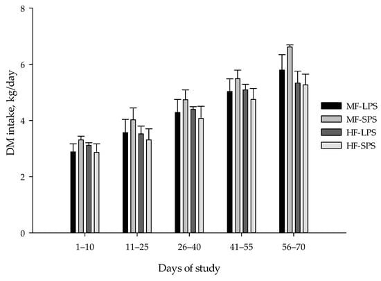 Chemical composition and particle size distributions of dietary treatments are listed in Table 4. There were interactions between fiber level and AH particle size on particles retained on 19 and 8 mm sieves. Particles retained on the 19 mm screen followed the decreasing order of HF-LPS > MF-LPS > HF-SPS = MF-SPS. Particles retained on the 8 mm screen were in the order of HF-SPS > HF-LPS > MF-SPS > MF-LPS. HF vs. MF diet resulted in a lesser proportion of particles retained on the 1.18 mm sieve (61.8 vs. 53.1%, p < 0.01) but greater GMPL (4.45 vs. 3.81 mm; p < 0.01), the top two sieves (30.2 vs. 20.9%; p < 0.01), and peNDF8 (10.0 vs. 6.0% of DM, p < 0.01). Diets containing SPS AH had a greater proportion of particles retained on the 1.18 mm sieve but had shorter GMPL (3.97 vs. 4.30 mm; p < 0.01), lower particles retained on the top two sieves, and peNDF8 (7.61 vs. 8.48% of DM; p < 0.01) compared with diets containing LPS AH.