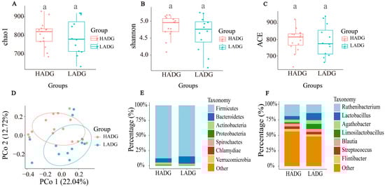 The α-diversity, β-diversity, and taxonomy between HADG and LADG. (A) The chao1 index. (B) The Shannon index. (C) The ACE index. (D) β-diversity. (E) The distribution of microbiota at the phylum level. (F) The distribution of microbiota at the genus level. If the small letters are the same, it indicates no significant difference (p > 0.05).