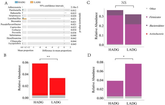The Stamp analysis and BugBase analysis between HADG and LADG. (A) Microbiota with significantly different abundance at the genus level. (B) Contribution rate in the formation of biofilm. (C) Contribution rate in potentially pathogenic organisms. (D) Contribution rate in aerobics. NS: No Significance, *: p < 0.05, **: p < 0.01.