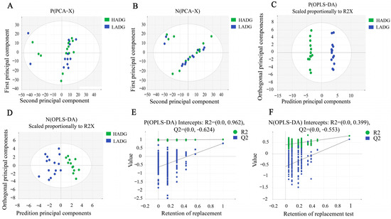 The PCA, OPLS-DA, and permutation score plots of serum samples collected from LADG and HADG based on LC-MS. (A) PCA score plot in the positive ion mode. (B) PCA score plot in the negative ion mode. (C) OPLS-DA score plot in the positive ion mode. (D) OPLS-DA score plot in the negative ion mode. (E) Permutation score plot in the positive ion mode. (F) Permutation score plot in the negative ion mode.