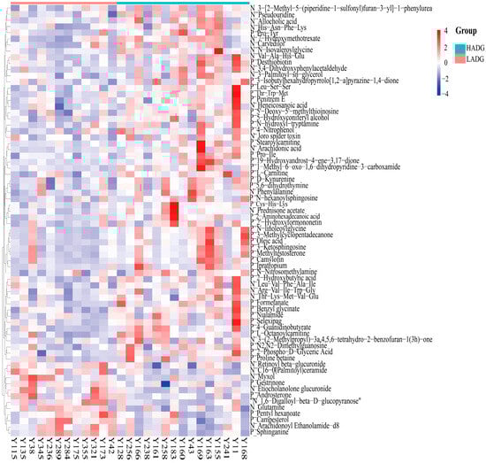 The heatmap of differential metabolites between LADG and HADG. The labels “P” and “N” denote positive and negative ion modes, respectively.