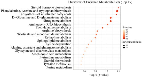 We investigated significant variations in metabolites between LADG and HADG, using untargeted metabolomics analysis on identical serum samples. Following filtration, a total of 1811 metabolites were identified in the positive ion mode, while 1039 metabolites were detected in the negative ion mode. The values of PCA analyses for the mode interpretation rates of X (R2X) in both modes exceeded 36.67% (Figure 3A,B). The OPLS-DA analysis in the positive ion mode and the negative ion mode alongside the R-squared values (R2Y) for mode interpretation were 0.98 and 0.79 (Figure 3C,D), and the prediction ability (Q2) was 0.762 and 0.642, respectively. The intercept of the permutation test was found to be lower than −0.55 (Figure 3E,F). In the comparative analysis between LADG and HADG, a comprehensive spectrum of 18 distinct metabolites was discerned in the negative ion mode (Table S2), while a distinct set of 52 metabolites emerged in the positive ion mode (Table S3). Distinct metabolites were acquired in the two modes, respectively (Figure 4). A total of 70 differential metabolites were found to be enriched in 19 metabolic pathways when comparing LADG to HADG (Figure 5), including steroid hormone biosynthesis, biosynthesis of unsaturated fatty acids, phenylalanine metabolism, and arachidonic acid metabolism. Notably, HADG exhibited higher enrichment in the metabolic pathways of unsaturated fatty acids (including arachidonic acid) and phenylalanine.