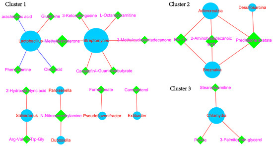 The Pearson correlation coefficients were calculated using 14 differential microbiota and 70 differential metabolites. There are a total of 27 pairs of microbiota–metabolite interactions (Figure 6). Cluster one, identified in the comparison between LADG and HADG, consisted of Lactobacillus, Streptomyces, oleicacid, methyltestosterone, phenylalanine, arachidonic acid, 3-methylcyclopentadecanone, L-octanoylcarnitine, 3-ketosphingosine, 4-guanidinobutyrate, camylofin, and glutamine. Cluster two, observed in the comparison between LADG and HADG, comprised Adlercreutzia, Pro-Tyr, 2-aminohexadecanoic acid, Breznakia, prednisone acetate, and Desulfosarcina. Cluster three, found in the comparison between LADG and HADG, included stearoylcarnitine, Chlamydia, Pro-Ile, and 3-palmitoyl-sn-glycerol.