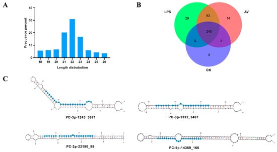 Characterization of miRNAs and the secondary structures of the novel predicted miRNAs. (A) Length distribution of all expressed miRNAs in silver carp. (B) Venn diagram of miRNAs from AV, LPS, and CK groups. (C) Secondary structures of the four novel predicted miRNAs.