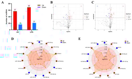Expression patterns of the DEmiRNAs induced by challenge groups (AV and LPS). (A) Number of DEmiRNAs in different groups. “Up” and “Down” indicate up- and down-regulated expression, respectively. (B,C) Volcano plot of DEmiRNAs: CK vs. AV (B); CK vs. LPS (C); (D) the top-15 significant DEmiRNAs in AV group; (E) the top-15 significant DEmiRNAs in LPS group. Red spot: significant up-regulated expression (Sig-Up); blue spot: significant down-regulated expression (Sig-Down); and gray spot: no significant difference in expression (No Diff).