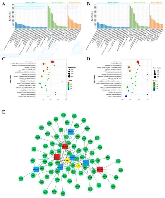 GO and KEEG enrichment analysis of DEmiRNA-predicted target mRNAs. (A,B) GO enrichment analysis of two challenge groups: CK vs. AV (A); CK vs. LPS (B); (C,D) KEEG enrichment analysis of two challenge groups: CK vs. AV (C); CK vs. LPS (D). Gene number: number of target genes in each pathway. Rich factor: the ratio of target genes to total genes in each pathway. (E) A network of miRNA–mRNA associated with the immune system. The squares indicate miRNAs; the red squares are up-regulated miRNAs and the blue squares are down-regulated miRNAs; the green circles are the target mRNAs for prediction and the yellow circles are the target genes for predicting miRNA co-regulation.