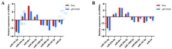 To verify the reliability of the sequencing results, eight DEmiRNAs were screened using U6 as an internal reference. The expression level of DEmiRNAs was detected via qRT-PCR; thereafter, the outcomes were contrasted with those of high-throughput sequencing analysis. The results confirmed that the expression profiles of these DEmiRNAs were significantly similar to those obtained using high-throughput sequencing analysis (Figure 4). There are some differences between these two methods. However, the trends in change are essentially the same. Overall, the qRT-PCR results confirm the RNA-seq results and support the reliability of the DEmiRNAs.