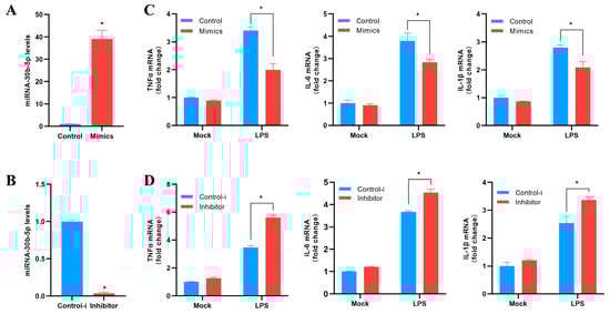 miR-30b-5p negatively regulates the expression of inflammatory cytokines. (A,B) Transfection of silver carp HKC with control mimics (control) and miR-30b-5p mimics (mimics) (A) or control inhibitor (control-i) and miR-30b-5p inhibitor (inhibitor) (B) at a final concentration of 100 nM. After 48 h, qRT-PCR was used to measure the expression of miR-30b-5p and normalize it to U6. (C,D) Mimics or control (C) and inhibitor or control-i (D) were transfected into HKC for 48 h. Following LPS stimulation of HKC, qRT-PCR was used to determine the mRNA expression levels of TNF-a, IL-6, and IL-1β, which were then normalized by GAPDH expression. In control cells, results were standardized to 1. The average and standard errors of three separate triplicate experiments are used to represent all data. Compared to controls, * p < 0.05.