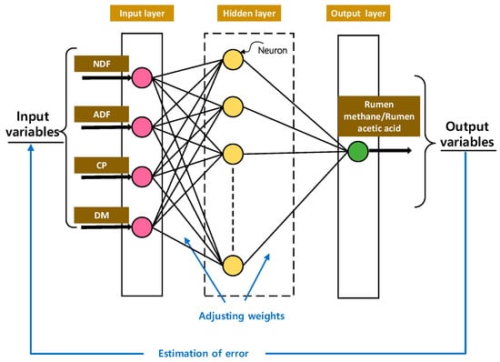 The network input layer comprises four input factors, namely NDF, ADF, CP, and DM. The output layer consists of one parameter, either rumen methane or rumen acetic acid. The objective function is defined as Equation (3). The establishment process is in reference to [], and the structure of the three-layer BP model is shown in Figure 2.