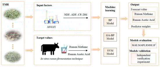 In this experiment, three machine learning algorithms, backpropagation (BP), the genetic algorithm (GA)-BP model and support vector machine (SVM), were used to establish the in vitro rumen fermentation models to predict rumen methane and rumen acetic acid, respectively.