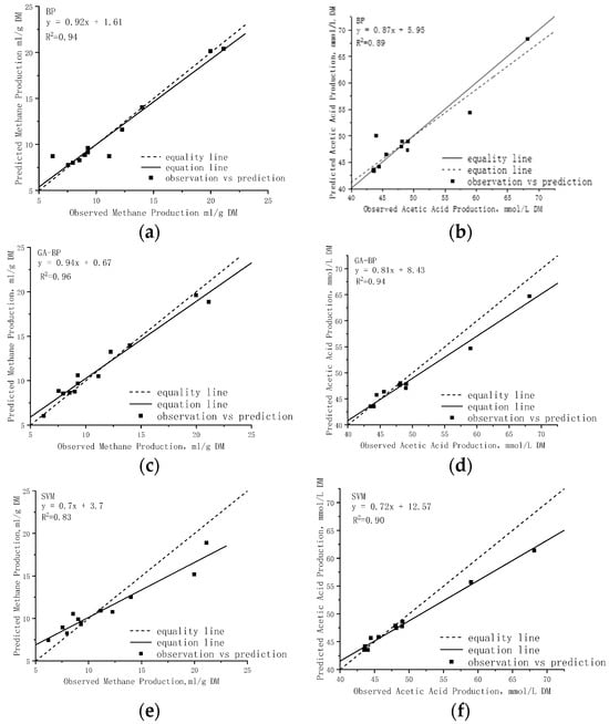 Regression results of rumen methane and rumen acetic acid in different models. (a) rumen methane BP−model; (b) rumen acetic acid BP−model; (c) rumen methane GA−BP model; (d) rumen acetic acid GA−BP model; (e) rumen methane SVM model; (f) rumen acetic acid SVM model.
