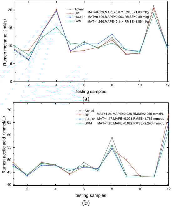 A comparative analysis of the metrics revealed that all models (in Figure 5) effectively simulated the response patterns of TMR diet composition to cow rumen fermentation. The results showed that the R2 values exceeded 0.80 for all models, with the GA-BP model exhibiting the strongest correlation among the testing samples (R2 = 0.96 for rumen methane and R2 = 0.94 for rumen acetic acid). The forecasting accuracy of these models are presented in Figure 6, where similar prediction errors were observed for ruminal fermentation variables. Specifically, Figure 6a illustrates the simulation of rumen methane across twelve diets, ranging from 3.03 mL/g to 20.39 mL/g, while measured values ranged from 6.2 mL/g to 21.13 mL/g, the average RMSE of the three models was 1.33 mL/g, with the GA-BP model exhibiting a reduction in RMSE values by 16.03% and 51.89% compared to the BP model and SVM model, respectively. Notably, sample NO.11 exhibited a maximum simulated methane value of 20.39 mL/g followed by sample NO.4, indicating a lower energy utilization efficiency in diets with higher simulated methane levels—a finding consistent with experimental results in dairy cow production. The results presented in Figure 6b demonstrate the efficiency of the models’ predictions for rumen acetic acid, as indicated by the low average MAPE (ranging from 0.021 to 0.025) and RMSE values within the range of 1.785 mmol/L to 2.248 mmol/L. The literature and previous studies have demonstrated a positive correlation between the rumen acetic acid content in rumen fermentation and the carbohydrate content in the TMR diet. Notably, the testing sample NO.12 exhibited the highest simulated value of rumen acetic acid content, reaching 68.15 mmol/L. Additionally, TMR diet sample NO.12 demonstrated the highest content of structural carbohydrate NDF and ADL among all samples. Importantly, these simulation results are consistent with the findings of previous studies.