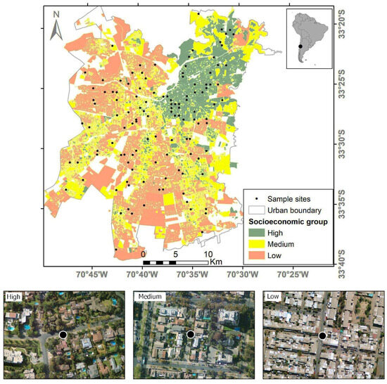 Santiago is a city that exhibits strong social segregation, as well as an uneven distribution of green space [36]. People of high income aggregate in the northeastern part of the city, which is also the urban area in the city with the greater vegetation cover. In fact, neighborhoods where people of higher income levels live commonly have larger green space area, greater woody cover, and greater diversity of plants than neighborhoods where people of lower income levels live [37,38,39].